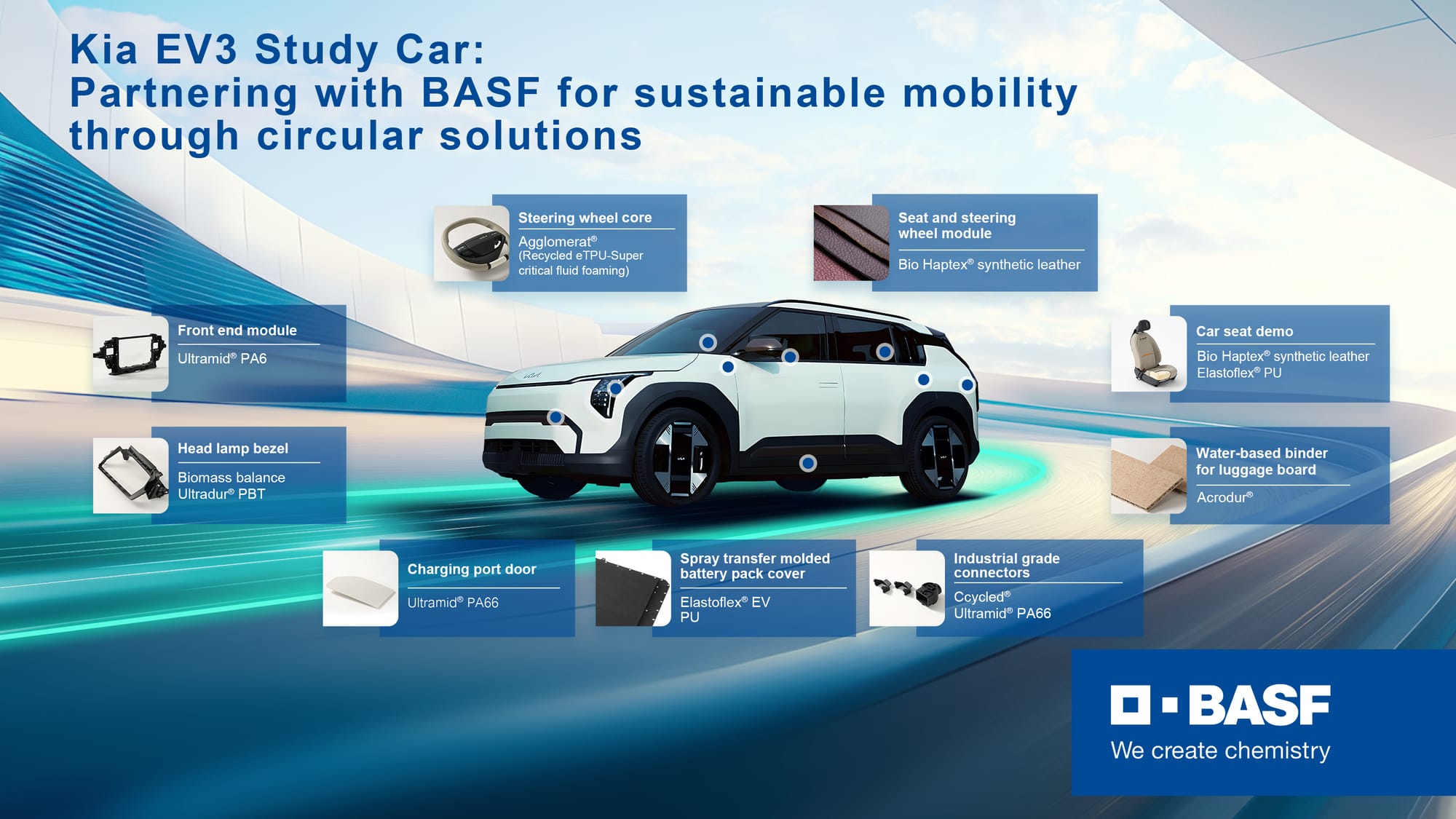 - Kia EV3 Study Car, the third concept car collaboration between Hyundai-Kia and BASF, features eight sustainable materials from BASF in various components, including plastics, textiles, tires, and steel. The materials include